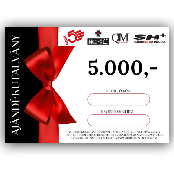 Az ajándékutalvány készpénzre nem beváltható, a felhasználása csak egy összegben lehetséges és a vásárlás dátumától számított 6 hónapig érvényes! beváltható a www.high5.hu weboldalon! Az ajándékutalvány beváltásánál más kedvezmény kupon nem váltható be. Az ajándékutalványok összevonhatóak!